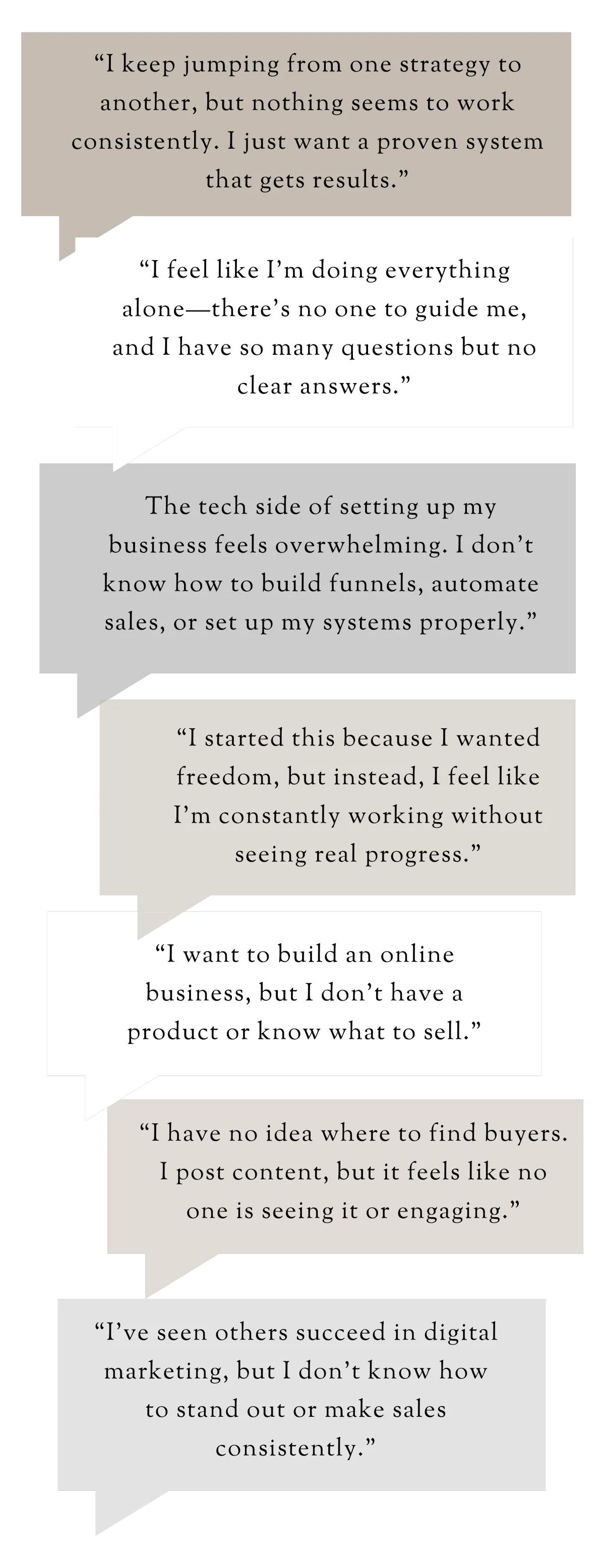 "The tech side of setting up my business feels overwhelming. I don’t know how to build funnels, automate sales, or set up my systems properly.”